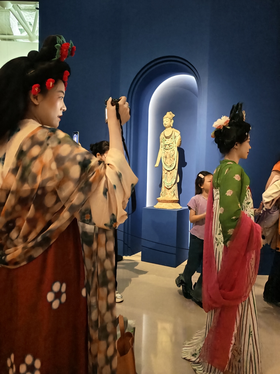 对观众而言,这既是一次展览,也是一个打卡出片的机会。身着古装的年轻人在展厅内相互拍照,与千百年前的古人同框,凭添一份古今交融的华装夏服之美。